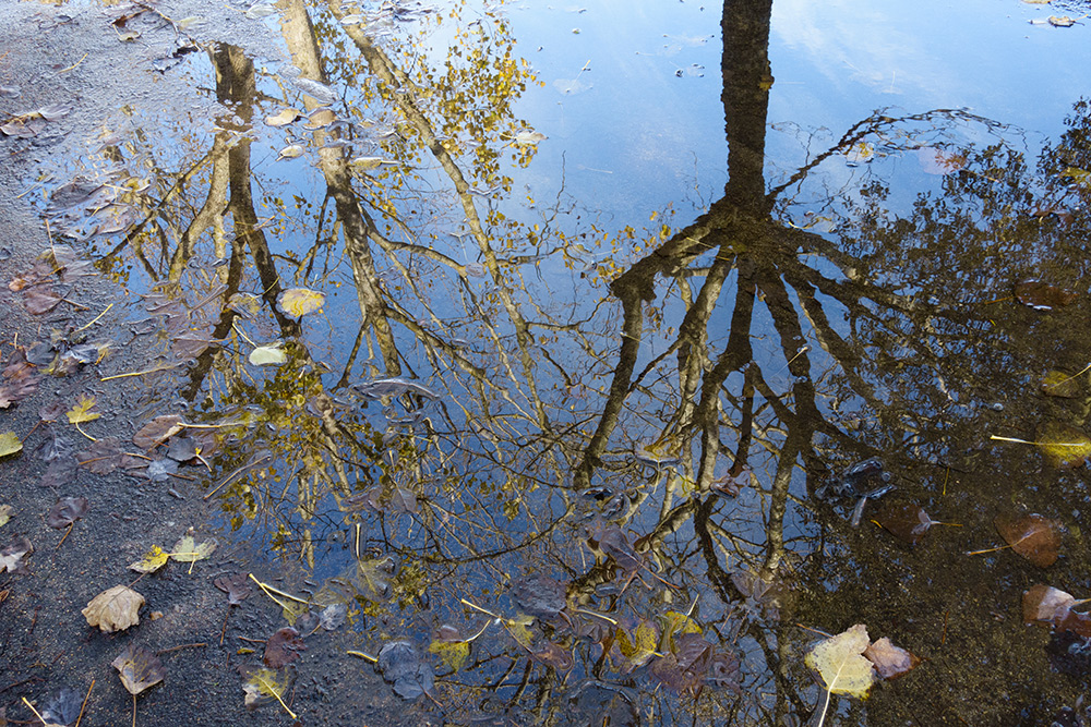 J'aime ce genre de photo. Le reflet de l'arbre sans feuilles avec les feuilles au sol. Mon