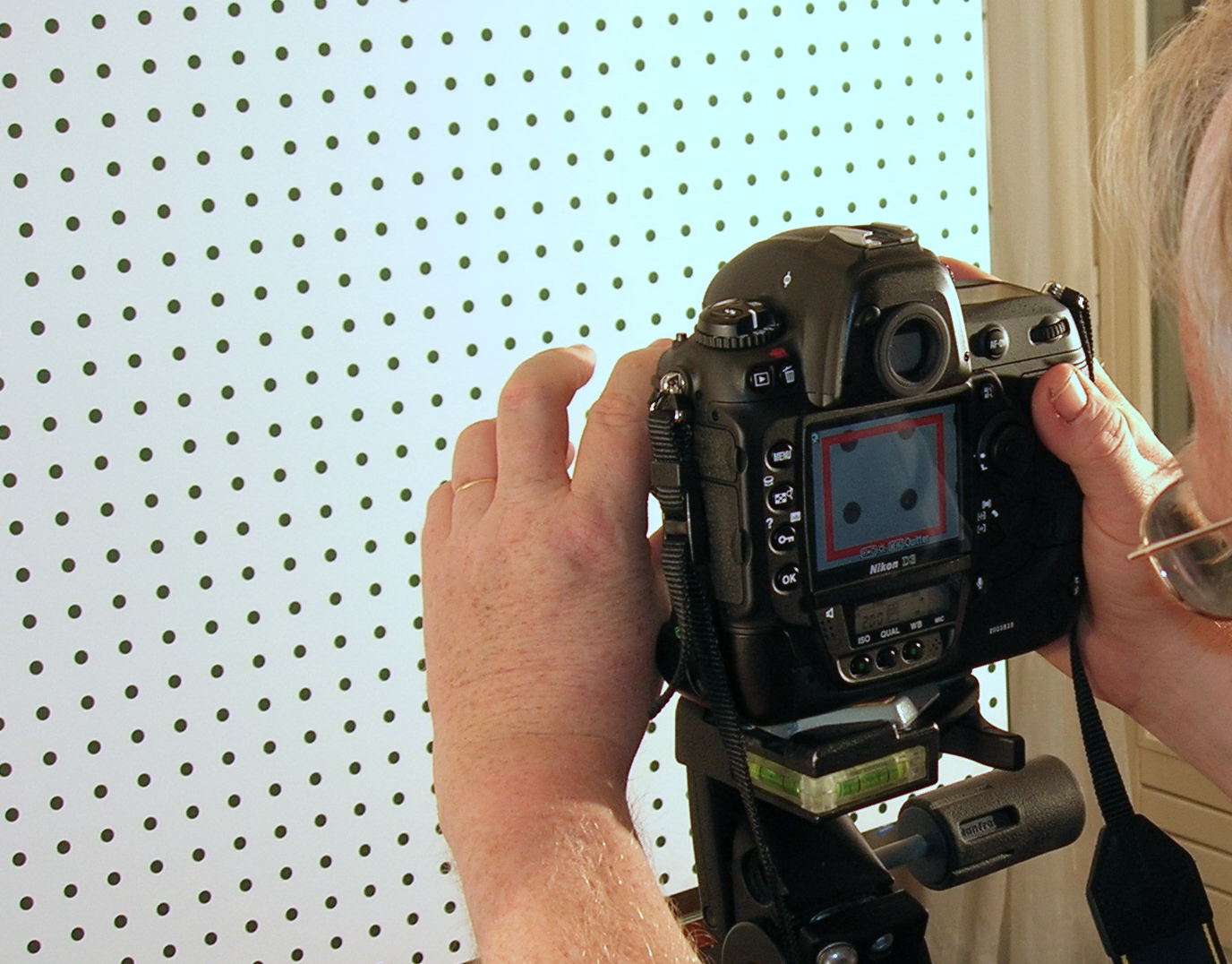 Sur test mire, en cas de doute sur l'autofocus on double la prise de vue en manuel. Dans ce cas, la mise au point avec loupe sur l'écran arrière live view est absolument imparable, parce que l'on s'affranchit de toute possibilité de micro décalage quelconque. Vous rendez vous compte qu'en précision maximale de mise au point manuelle sur un D3 on va se retrouver avec seulement 4 points de mire à l'écran et que l'on fait la mise au point sur la petite frange blanche d'accentuation de l'appareil ? La cible du capteur AF central se trouve agrandie à 100% écran sur l'écran arrière...vous imaginez çà même avec le meilleur viseur du marché en optique, quelle loupe derrière ce viseur pour arriver à cette précision ?