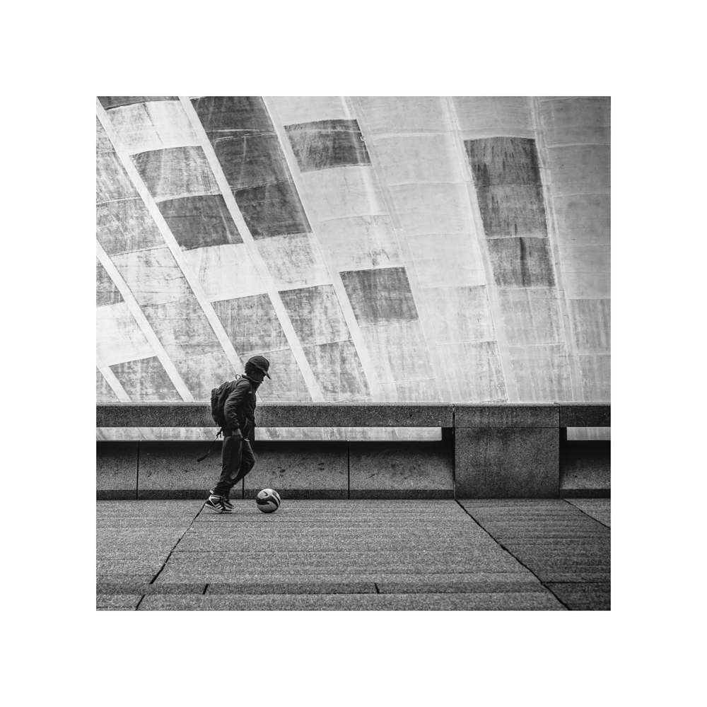 C'est la voute du CNIT, je pense… Bonne idée et beau cadrage, mais pour moi, la silhouette de l'enfant ne se détache pas assez, dans sa gestuelle (il a les deux jambes alignées, le visage un peu masqué, etc.) et dans son contraste (il se confond un peu trop dans la rambarde très sombre)