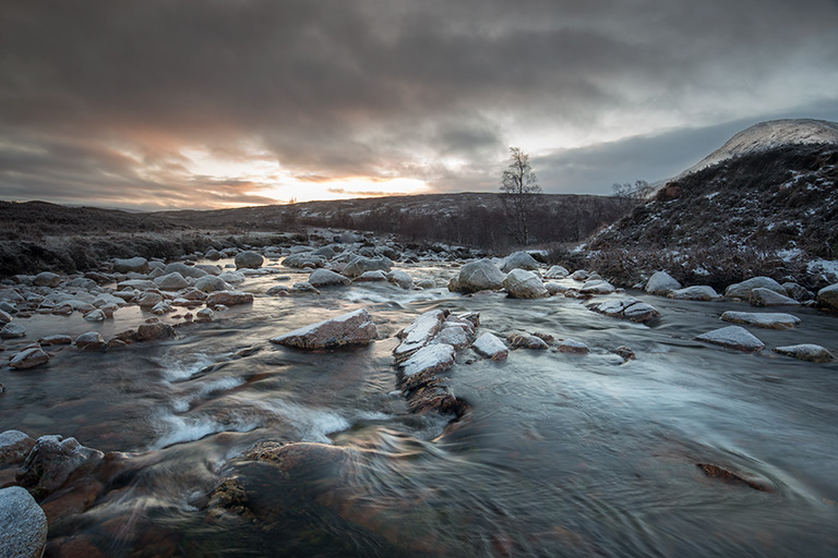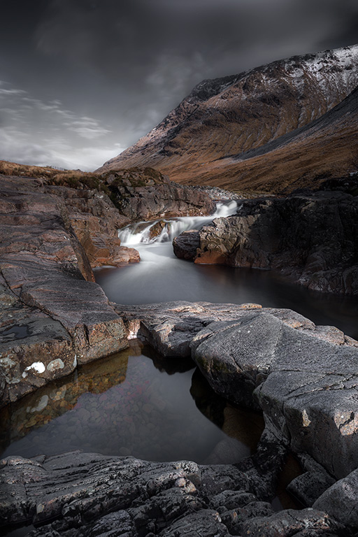 Bonsoir à tous. je suis rentré de mon second périple en Ecosse, en hiver cette fois ci dans la région de Glencoe. Mon van aménagé ayant fait des siennes avec le système électrique, ma liberté n'a pas été tout à fait complète, m'obligeant à dormir dans des campings le soir sauf la première nuit. Sur site le soir, j'ai pu profiter pleinement du lever du jour après quelques chutes de neige et gelées nocturnes. La première photo est tirée de ce matin là. Surprise en arrivant prés de la rivière, une douzaine de photographes en ligne pour un workshop matinal. Inutile de vous dire que cela m'a obligé à bouger différement autour du site.