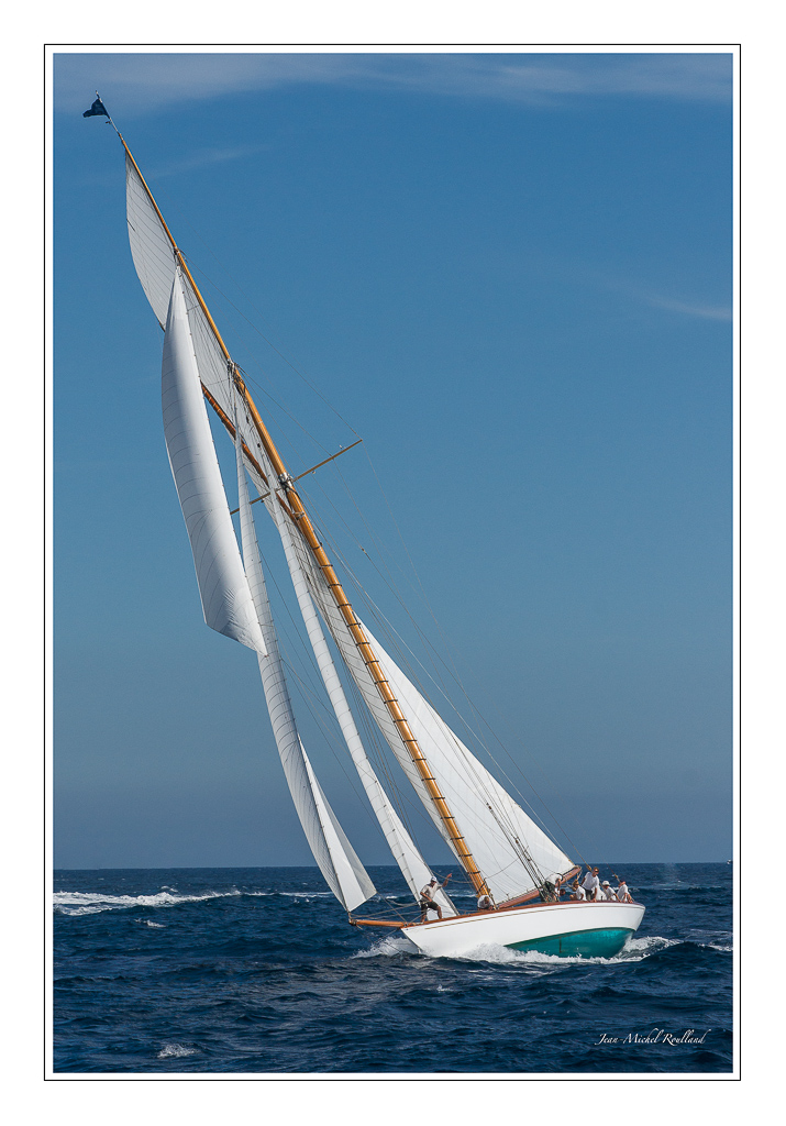 Effectivement , je vois bien que certaines images " buttent " sur le bord du cadre . A ma décharge , je dois dire que cadrer précisément par force 4 quand on est embarqué , c'est assez sportif ! J'ai souvent dû souvent reprendre les horizons . De plus comme nous naviguions à contre sens des régates ( eh oui , pas question de courir après , ils ont beaux être quasiment centenaires , les bougres, ils filent encore bien ) nous nous retrouvions trop près et même à 70 mm , j'étais encore trop long . C'était une première pour moi . Avec du recul , en trois sorties , j'ai compris pourquoi certaines images avaient plus de force que d'autres : à mon avis les images de travers sont rarement intéressantes , les plus intéressantes sont celles trois quart de face ou trois quart arrière .